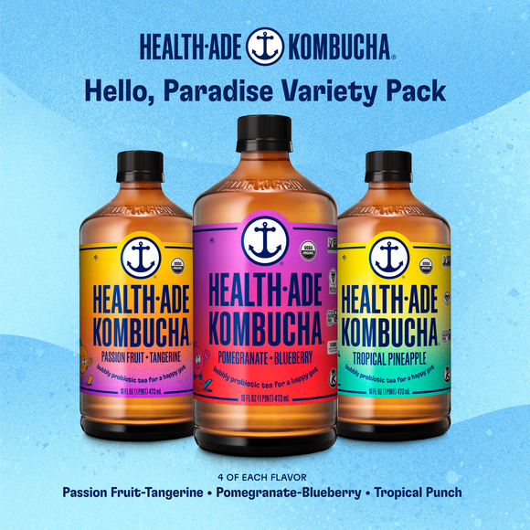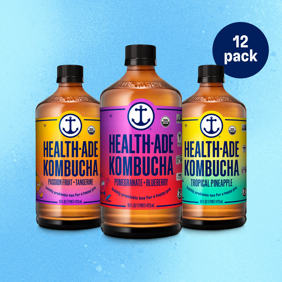 Tea, water, sugar and a culture (the collection of microorganisms responsible for fermentation) are all you need to make kombucha! Every flavor of Health-Ade Kombucha contains organic black and green tea, water, organic cane sugar, live kombucha cultures, acids from fermentation (lactic, acetic, gluconic, tartaric), and 1 billion* culture-forming-units of live active cultures from a clinically-backed lactobacillus bacteria called "bacills coagulans" (*at time of bottling). To create each unique flavor, we add juice or extracts from organic produce. For more detail about each specific flavor, check out the ingredient list and Nutrition Facts Panel on that bottle or can.